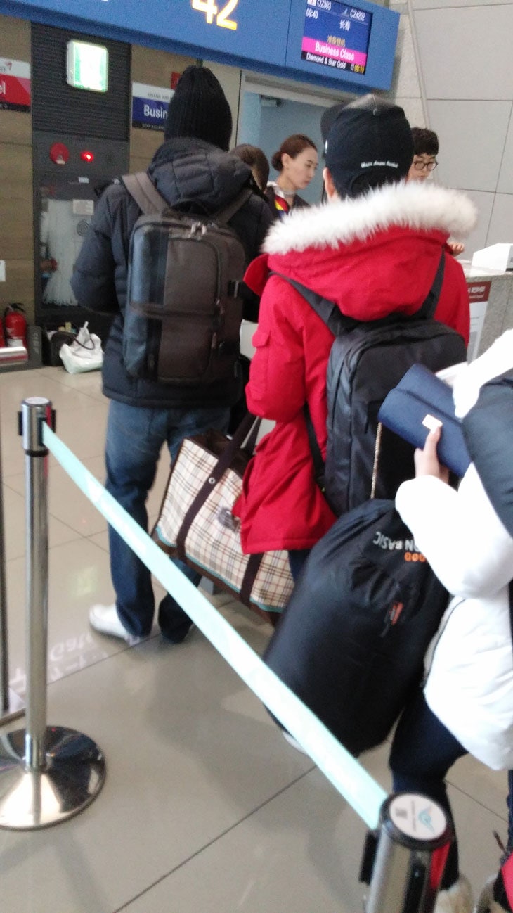 우리는 아시아나 항공게이트에서 줄을 서서 탑승권을 다 받았습니다.